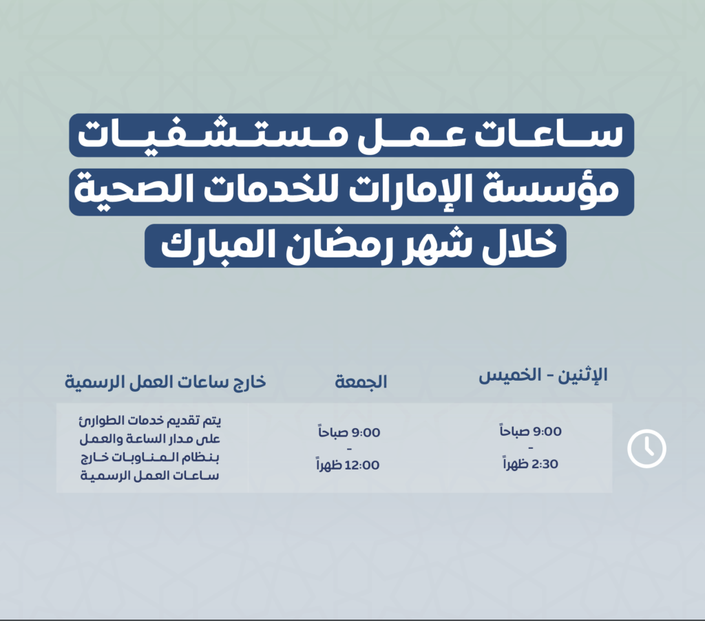 الإمارات العربية المتحدة – دبي 22 مارس 2023: أعلنت مؤسسة الإمارات للخدمات الصحية مواصلة عمل أقسام الطوارئ في جميع المستشفيات، ومراكز الرعاية الصحية الأولية التابعة لها خلال شهر رمضان المبارك، وتقديم خدماتها على مدار الساعة، والعمل بنظام المناوبات خارج ساعات العمل الرسمية، فيما تعمل المنشآت الصحية التابعة للمؤسسة بنظام العمل الصباحي والمسائي وفقاً للساعات المحددة للدوام طيلة أيام رمضان المبارك.