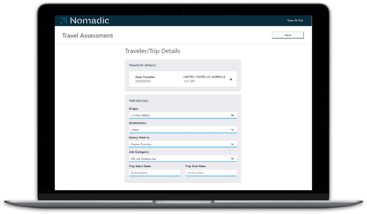 يعزّز تقييم الامتثال لإجراءات ما قبل السفر من خدمات نومادك الشاملة وذلك بالاستفادة من معلومات ونقاط البيانات الخاصة بشركة فراغومين من أكثر من 170 دولة. تضمن ميزة نومادك الفريدة لحفظ ملف تعريف المسافر إمكانية تخزين سجل السفر والبيانات بشكل آمن، مما يمنع إدخال المعلومات المتكررة. بالإضافة إلى ذلك، ومع ميزة نظام تحديد المواقع العالمي الخاصة بحل نومادك، تتم مراقبة مواقع المسافرين في الوقت الفعلي لضمان الامتثال لسلطات الهجرة وإرسال تنبيهات فورية حول صلاحية التأشيرة.