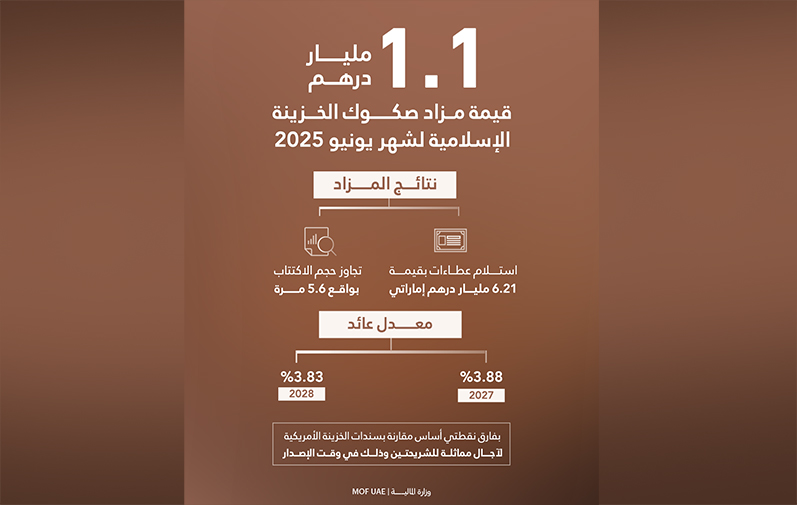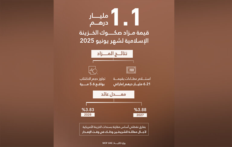 أعلنت وزارة المالية بصفتها الجهة المُصدرة وبالتعاون مع مصرف الإمارات العربية المتحدة المركزي بصفته وكيل الإصدار والدفع، عن نجاح مزاد صكوك الخزينة الإسلامية “T-Sukuk” المقوّمة بالدرهم الإماراتي، لشهر يونيو بقيمة إجمالية بلغت 1.1 مليار درهم، وذلك ضمن برنامج صكوك الخزينة الإسلامية لعام 2025 كما تم نشره على الموقع الرسمي للوزارة.