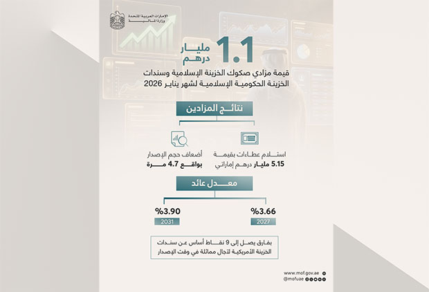 أعلنت وزارة المالية بصفتها الجهة المُصدرة، وبالتعاون مع مصرف الإمارات العربية المتحدة المركزي بصفته وكيل الإصدار والدفع، عن نجاح مزادي صكوك الخزينة الإسلامية (T-Sukuk) وسندات الخزينة الحكومية (T-Bonds) المقوّمة بالدرهم الإماراتي، لشهر يناير 2026 ، بقيمة إصدار إجمالية بلغت 1.1 مليار درهم، وتمثل هذه الإصدارات أول عمليات طرح ضمن برنامجي الصكوك والسندات لعام 2026 كما تم نشره على الموقع الرسمي للوزارة ، ويمثل الإصدار الجديد لسندات الخزينة أول شريحة يتم طرحها ضمن البرنامج منذ مارس 2023، ما يدعم تطوير منحنى العائد وتعزيز عمق السوق الثانوية.